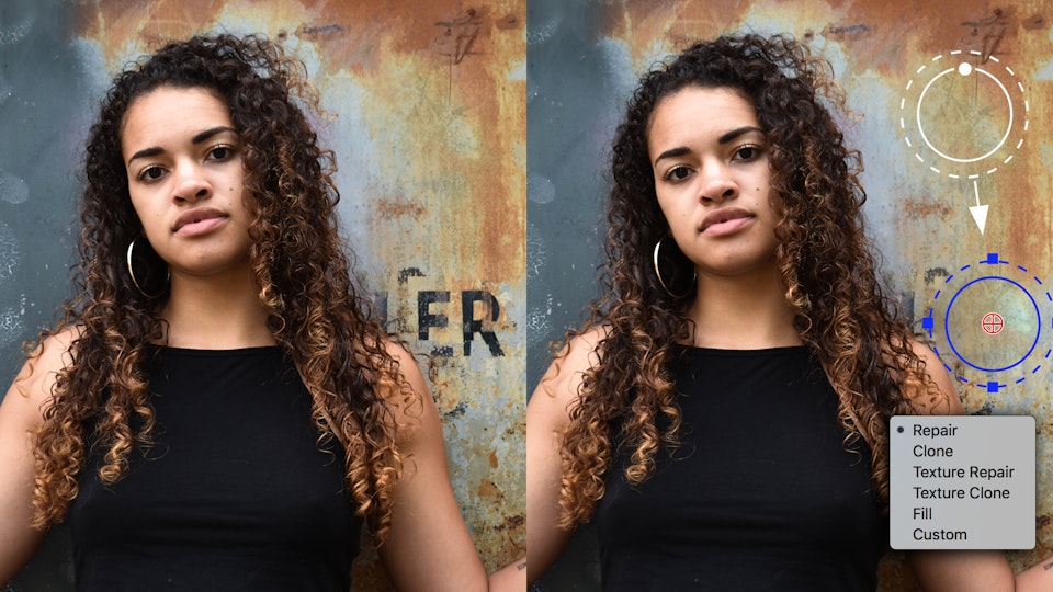 Die Benutzeroberfläche von Spot Clone Tracker macht das Kopieren von Pixeln aus anderen Bereichen deiner Aufnahme schnell und einfach. Definiere den zu bereinigenden Spot und die Quelle des Klons mit Hilfe des grafischen Overlays.