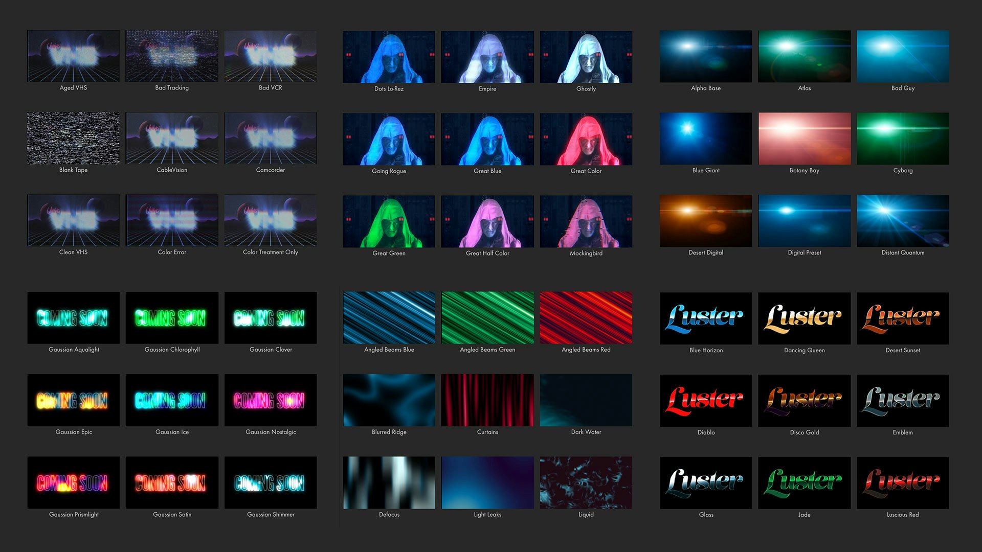 Give your footage authentic retro and modern day looks using tools like VHS, Retrograde Carousel, Glitch, Holomatrix II, and more.