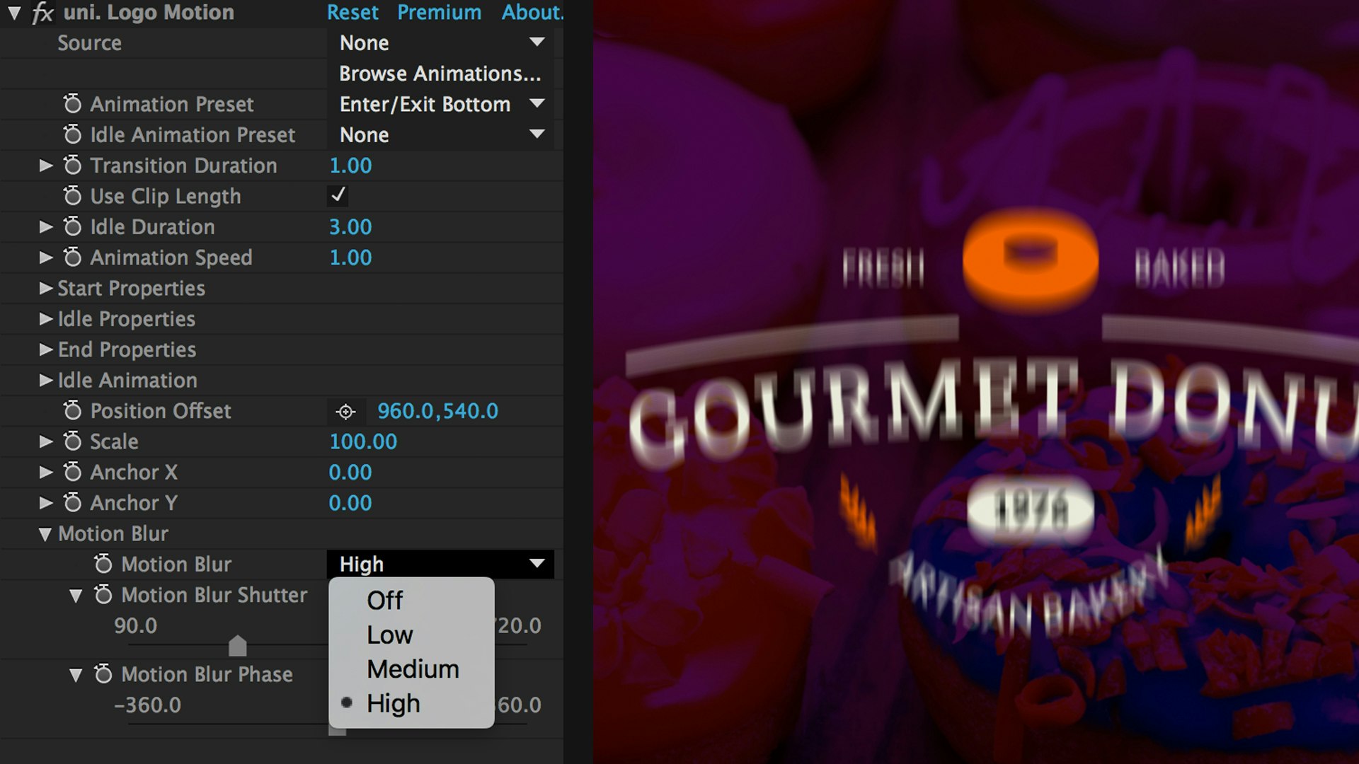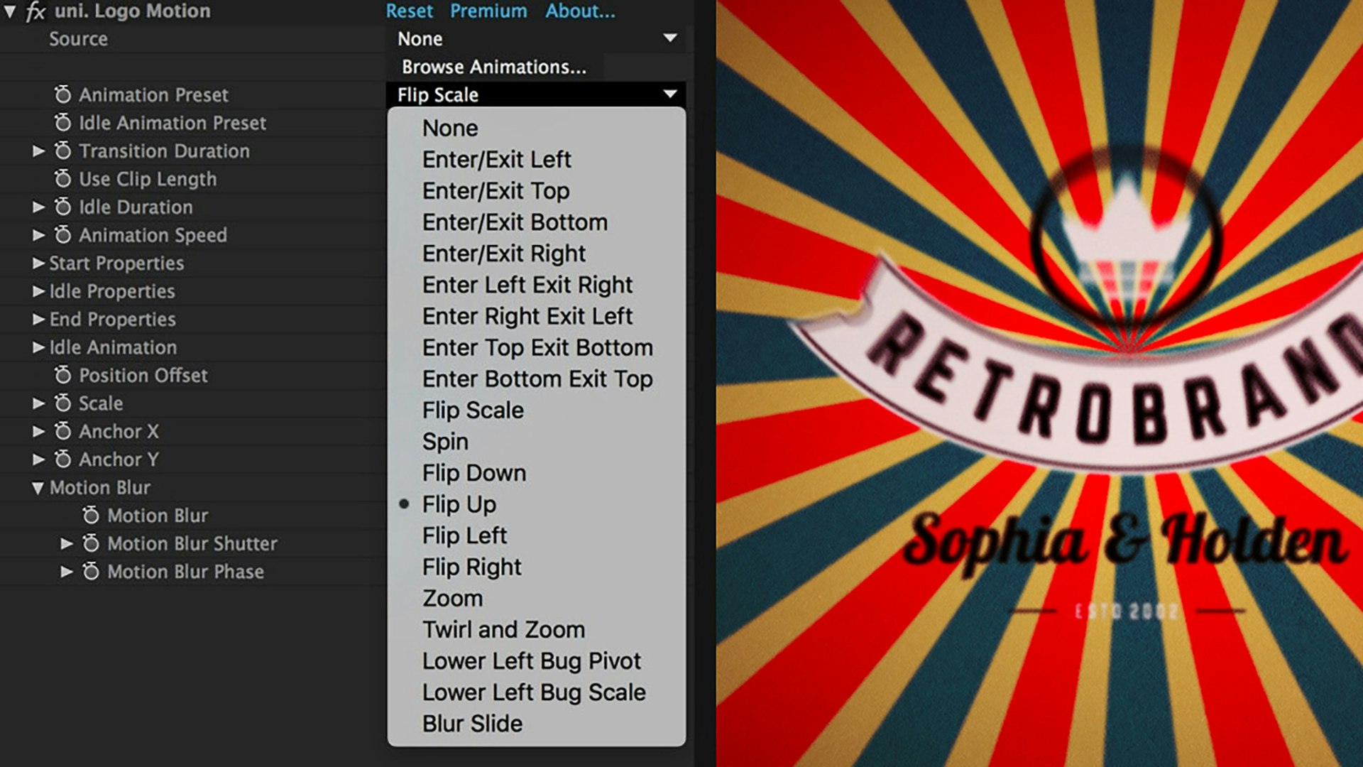 Apply Logo motion and choose from more than 15 customizable presets that auto-animate your layer appearing on screen, idling and exiting.
