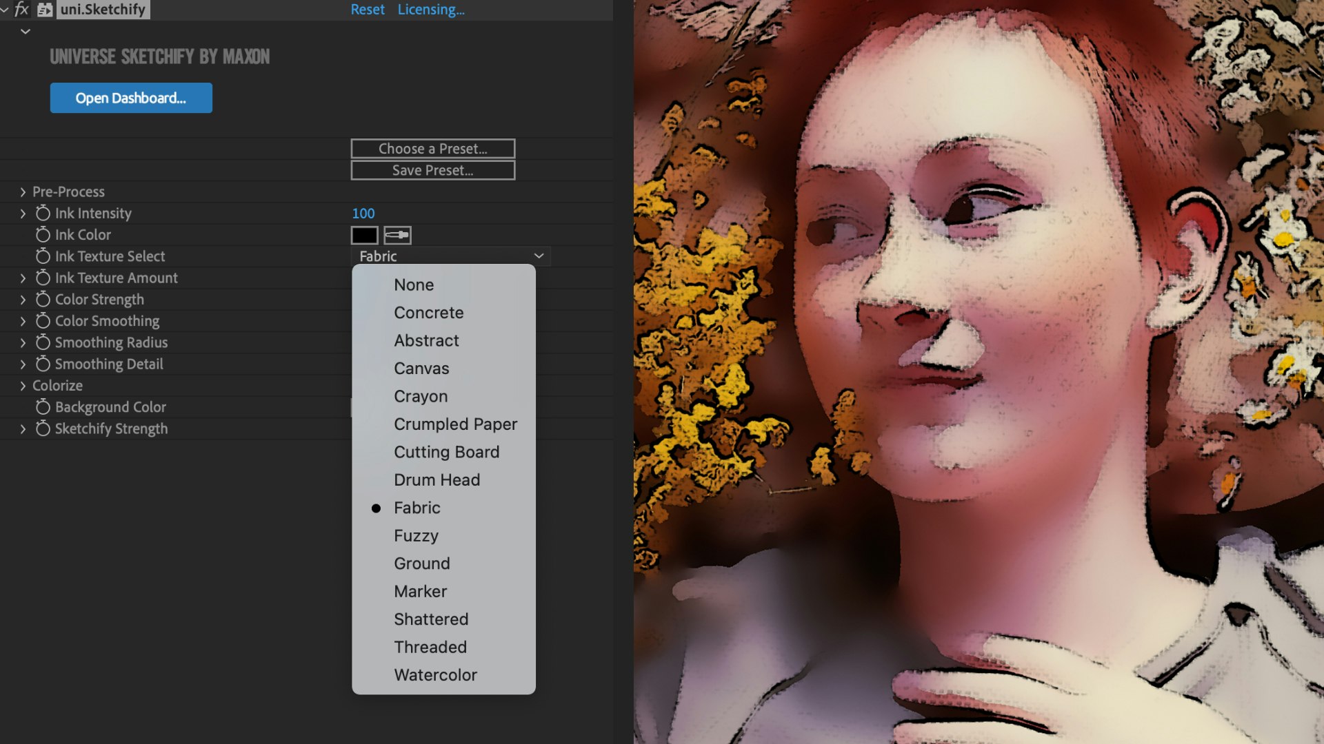 Sketchify allows you to dial in the intensity of the ink contour lines. Use the ink texture presets to add looks like concrete, crumpled paper, crayon, marker, and more. It pairs nicely multiplied over a Texturize Motion layer.