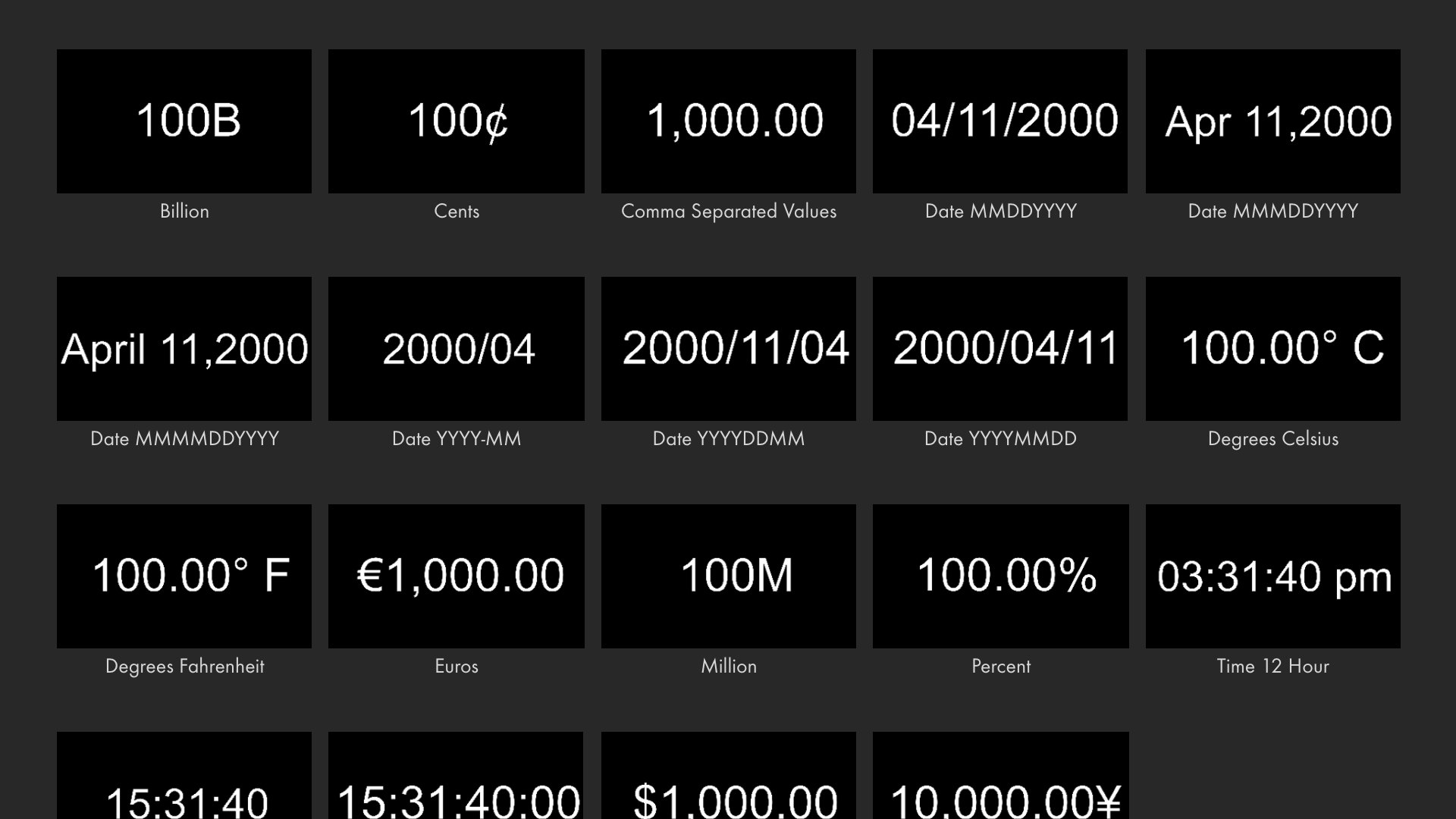 Renderizzate e animate un'ampia varietà di numeri in ogni formato, comprese le valute, le percentuali, le date e l'ora. Vedi il nostro tutorial introduttivo.