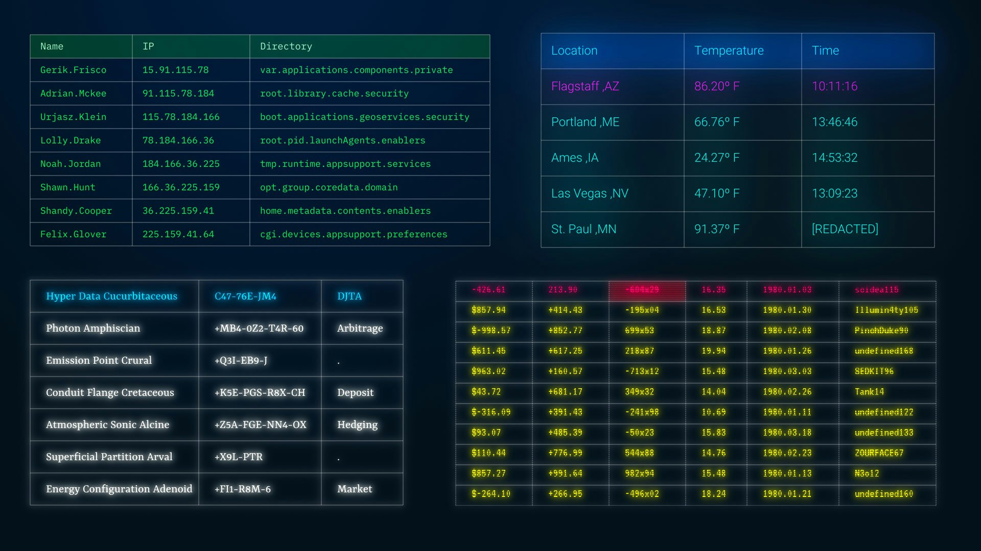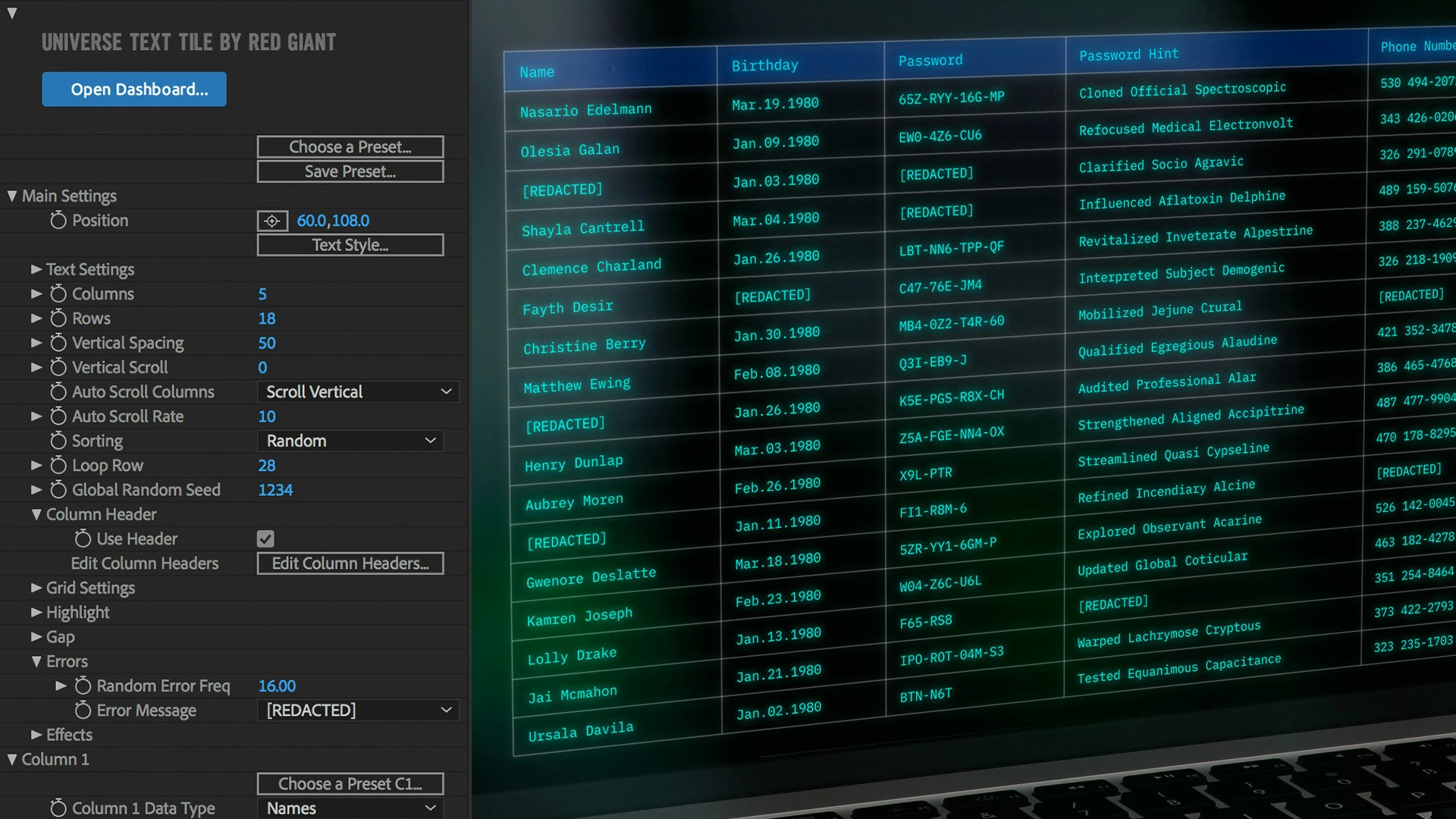 Generate colonne multiple piene di dati casuali per l'uso in motion graphics e per effetti di computer terminali. Le informazioni visualizzate possono essere sia statiche che animate. Vedi il nostro tutorial introduttivo.